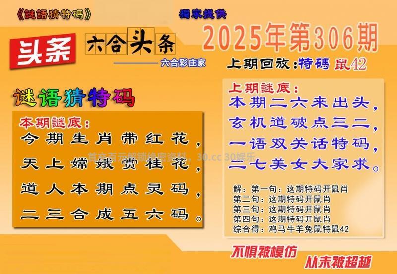 305期 本期二六来出头 玄机道破点三二 一语双关话特码 二七美女大家求 解译:一语双关话特码指双肖龙马猴狗虎鼠,二七美女大家求指吉美肖羊兔鸡龙马蛇 九肖:龙马猴狗虎鼠羊鸡兔 六肖:龙马猴狗虎鼠 |